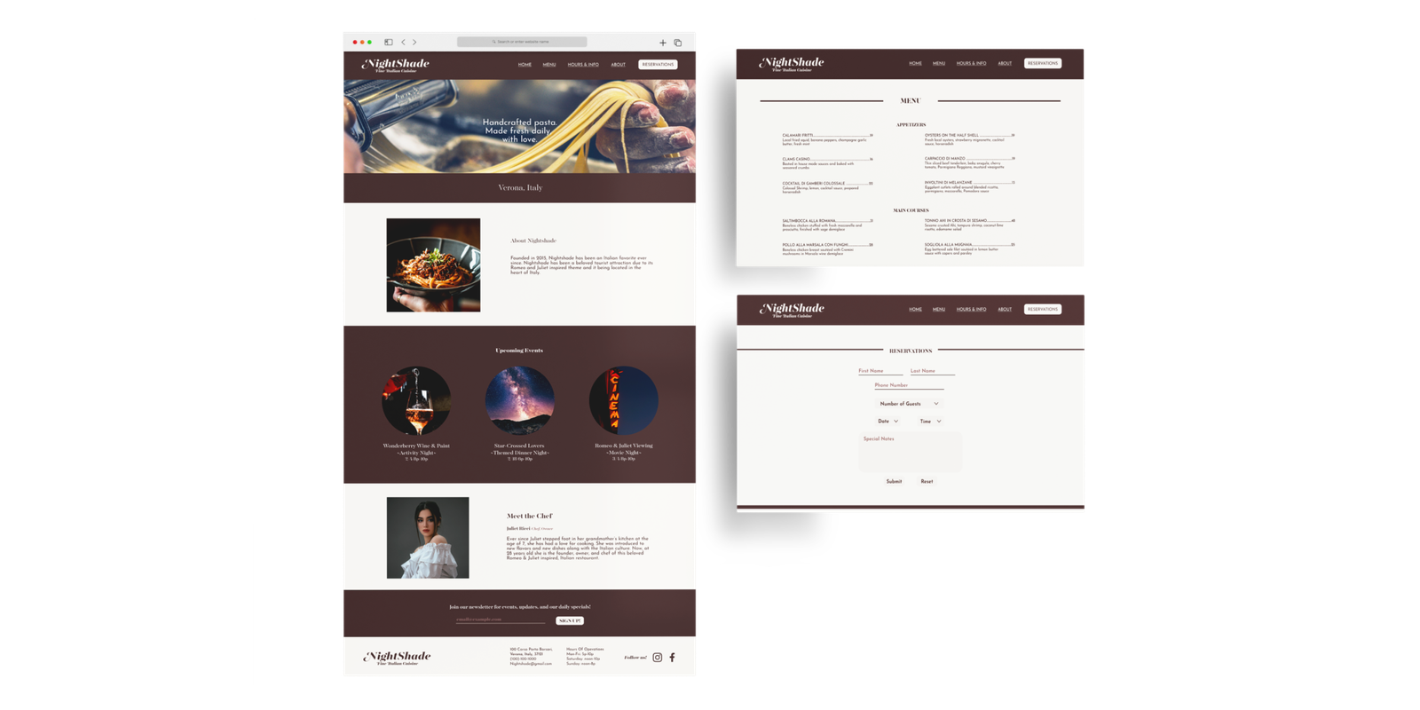 Located in the heart of Italy, Nightshade Italian Cuisine is a favorite amongst locals and tourists. In need of a user-friendly website, complete creative freedom was granted while designing these three cohesive web pages for this fictitious restaurant.