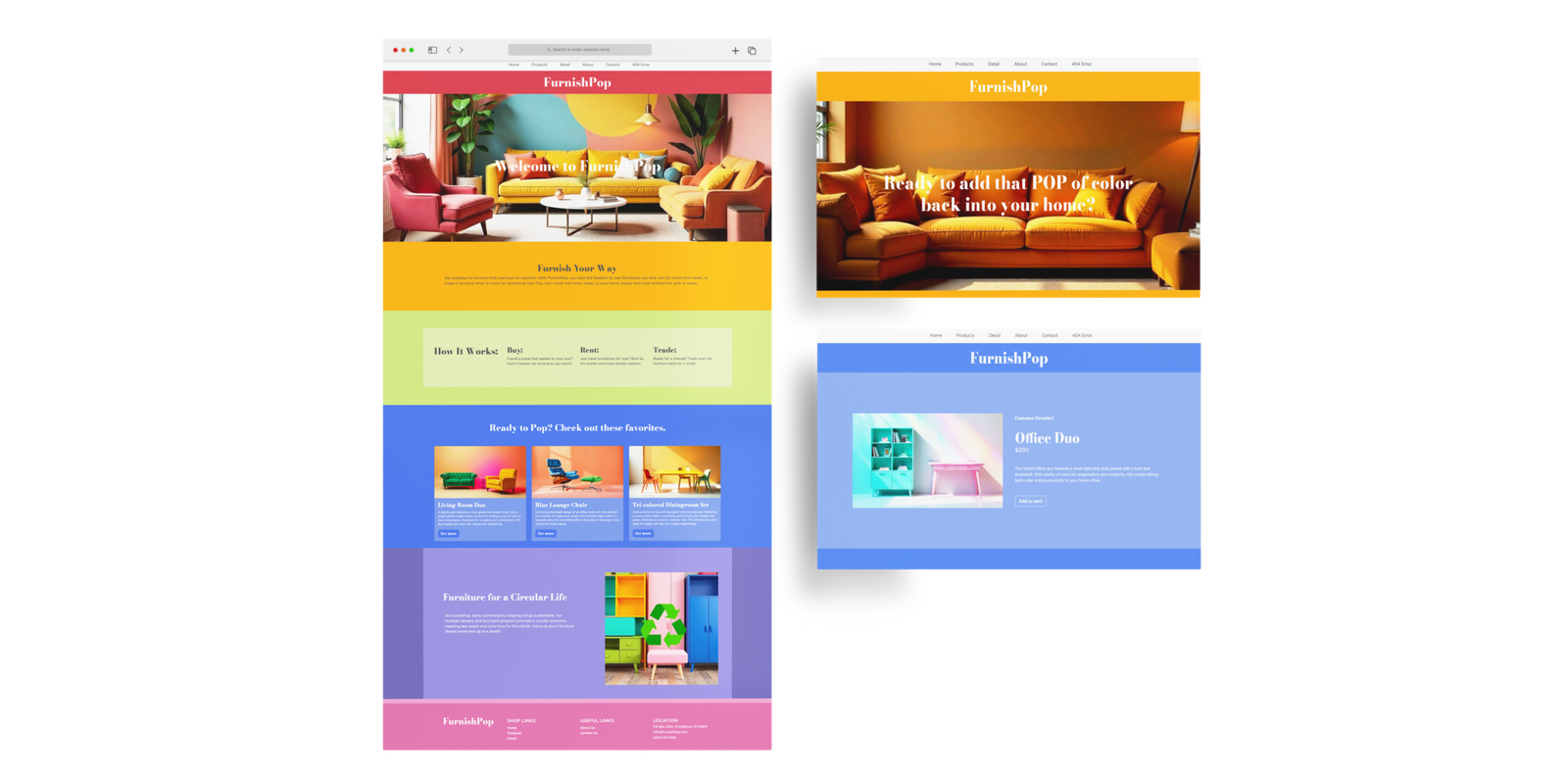 FurnishPop’s website brings playful energy to sustainable living. Designed in Figma and coded in Bootstrap, this six-page site showcases a cohesive and engaging experience. The homepage welcomes users with bright visuals and a bold introduction to the brand. The products page highlights an array of colorful, modular pieces, while the detail page gives shoppers a closer look at each item, complete with flexible purchasing options. The about page shares FurnishPop’s commitment to circular design, and the contact page keeps communication easy and inviting. With its eye-catching aesthetic and user-focused layout, FurnishPop proves that sustainable furniture can be both stylish and accessible.
